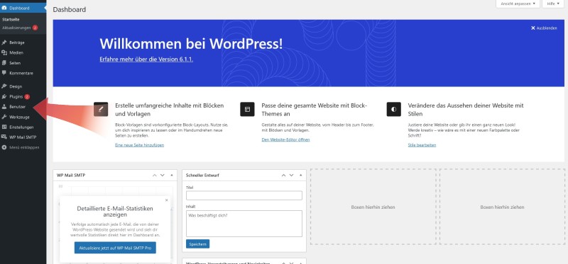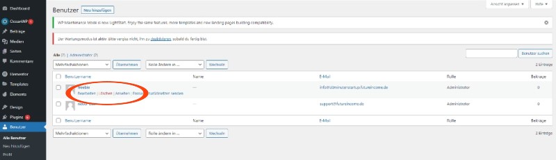 Wenn noch nicht geschehen, logge dich jetzt mit deinem neuen Benutzer ein und klicke in der linken Spalte auf Benutzer. Wenn du mit der Maus über den Benutzernamen fährst, erscheint ein kleines Menü.