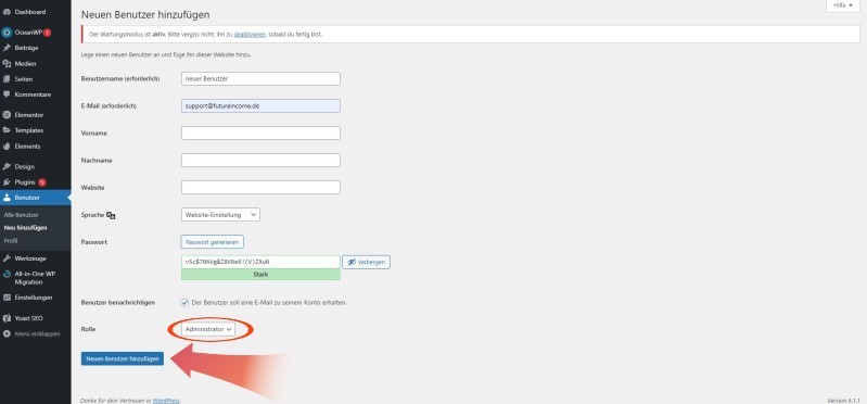 Bei Rolle musst du unbedingt „Administrator“ auswählen. Sonst hast du später keinen Vollzugriff auf dein Backend.
