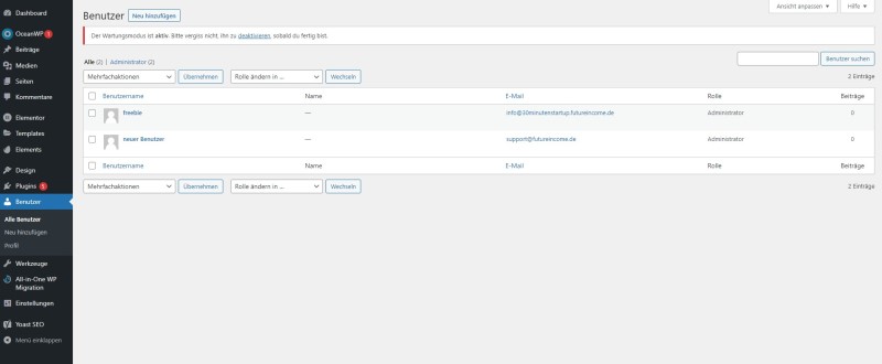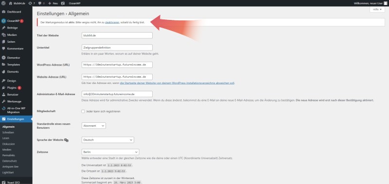 Deine Website befindet sich nach der Installation im Wartungsmodus. Nur Eingeloggte User können momentan die Website sehen. Weiter unten erfährst du, wie du den Wartungsmodus abstellen kannst.