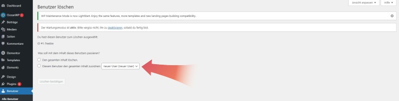 Hier musst du auswählen, was mit den Daten des zu löschenden Benutzers passieren soll.