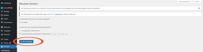 Klick jetzt auf den Auswahlbutton vor dem Text, wähle den Benutzer aus und klicke anschließend auf „Löschen bestätigen“.